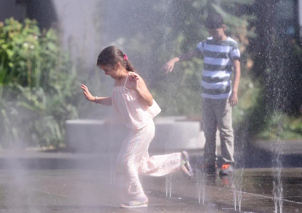 7月3日,在奥地利维也纳,孩子们在一处喷泉装置旁玩耍。新华社记者 贺灿铃 摄